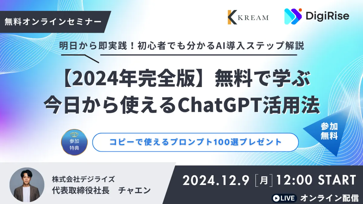 AI技術の進化に伴い、企業の業務にAIを取り入れることが求められています。特に2024年度に向けて、業務効率を高めるためには、AIの活用が重要なポイントとなります。今回、AIツール「AI Works」を提供する株式会社デジライズは、業界の第一線で活躍するAI専門家、茶圓将裕(ちゃえん まさひろ)氏を招き、【ChatGPT実践活用セミナー】を開催することが決定しました。