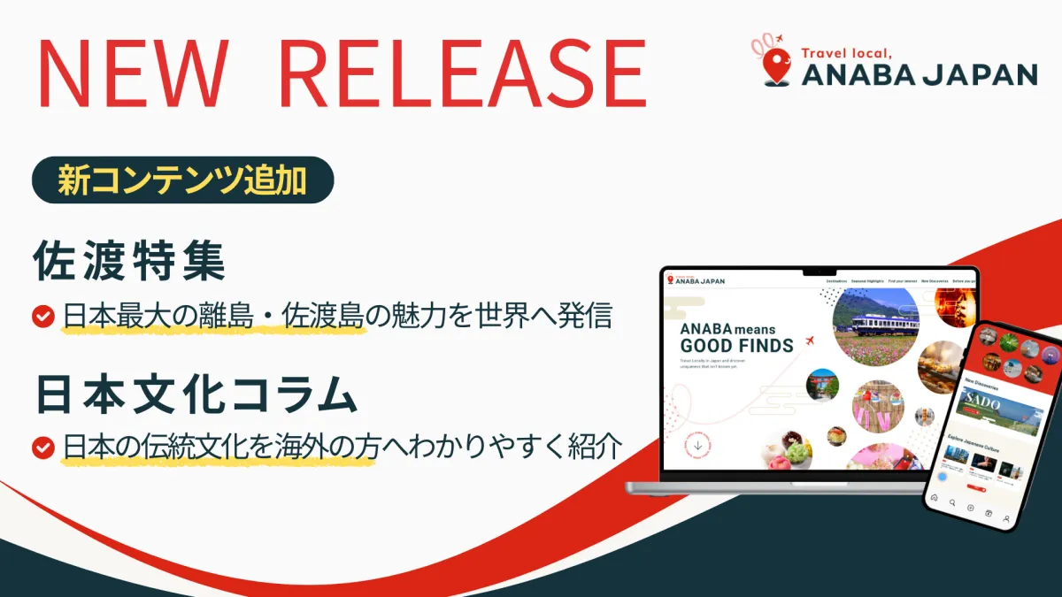 SUN株式会社が運営する観光情報サイト「ANABA JAPAN」に、新たに「佐渡特集」と「日本文化コラム」が追加されました。この新コンテンツは、佐渡島の素晴らしさを多国籍で広めることを目的としており、特にインバウンド旅行者に向けた情報発信がますます充実しています。これにより、日本の隠れた魅力を知る契機が増え、訪日観光をより楽しんでいただけるよう努めています。