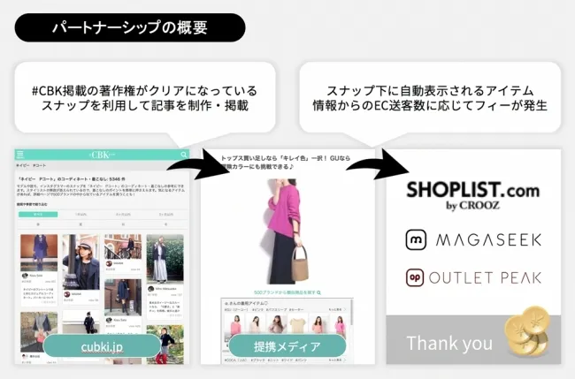 提携メディアは、#CBKの公式モデルのスナップを基に商品関連の情報を表示させ、ECサイトへのトラフィックを促進することで収益を得ることができます。例えば、WOMAGAzineやBIGLOBEニュース、MARBLEなど、多くのメディアがすでにこの仕組みの導入を進めています。