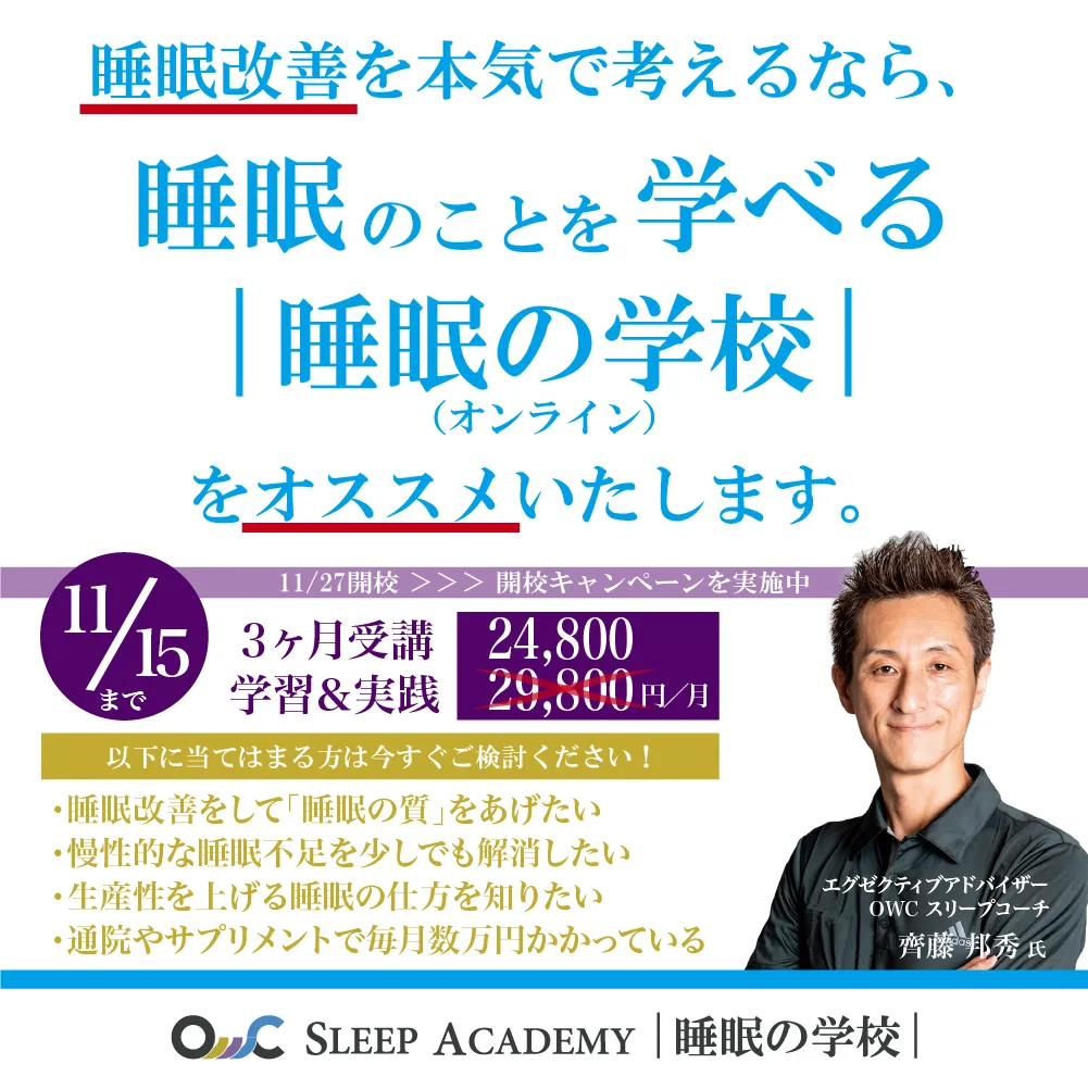 『睡眠の学校』では、11月27日の開校に向け、特別な入校キャンペーンを実施中です。キャンペーンは11月15日までで、この期間に入校手続きを行った方には特典が用意されています。詳しくは公式ページをご確認ください。
