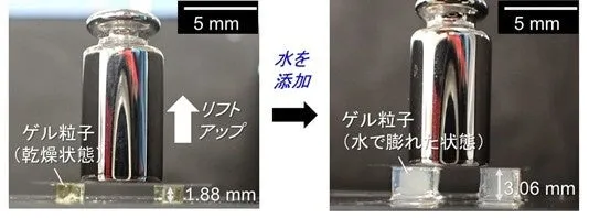実験の際、この立方体粒子を4つ並べ、その上にガラス板と約10グラムの重りを置きました。水を加えると、粒子は水を吸収し、徐々に膨張して重りを約1ミリ持ち上げることに成功しました。このプロセスは電気やモーターを使わず、水を吸収する自然の現象を利用して行われました。これにより、環境にも優しい技術として評価されています。