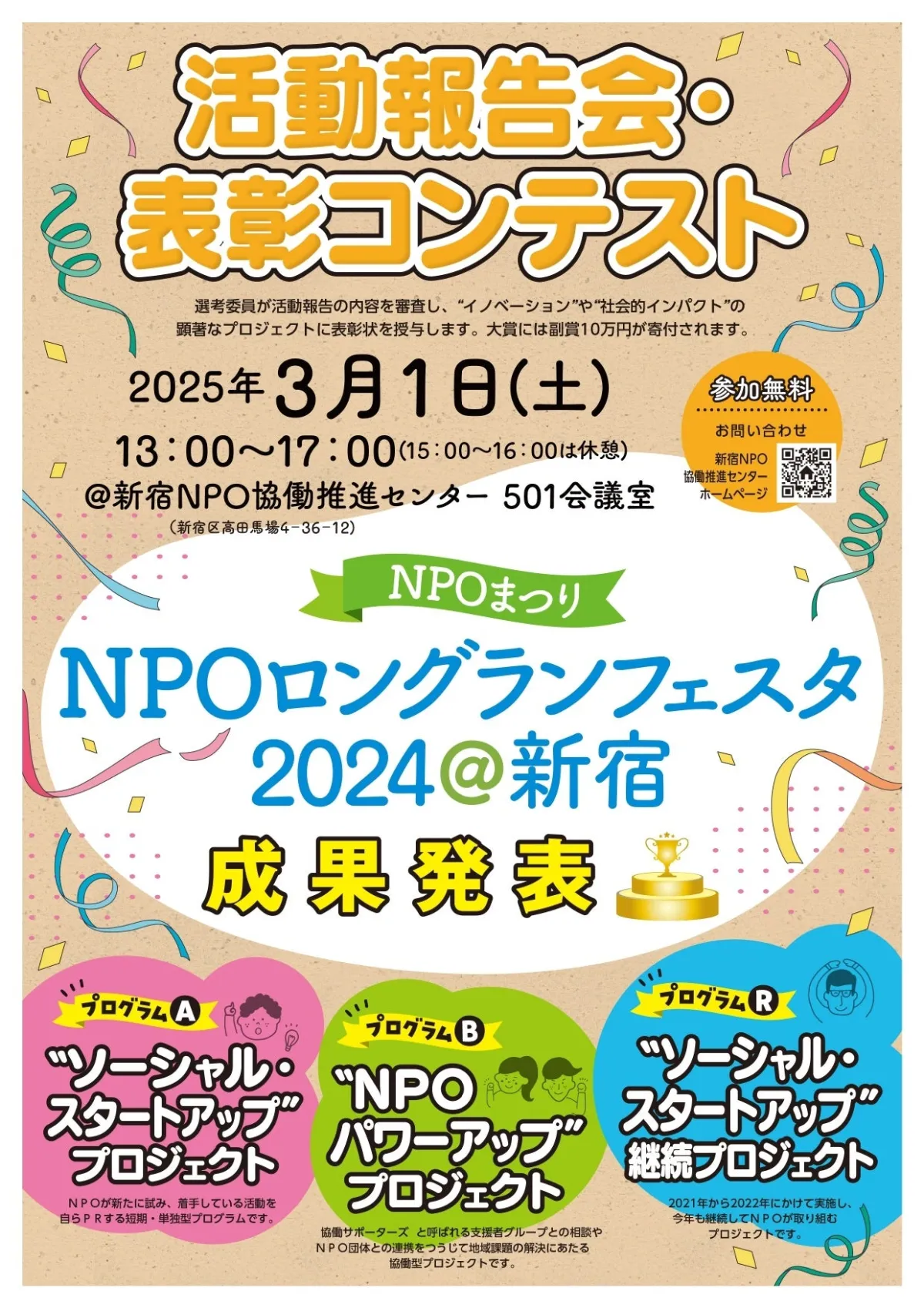 社会の課題に取り組む団体が集まり、活動の成果を報告する「NPOロングランフェスタ2024@新宿」の活動報告会と表彰コンテストが、3月1日(土)に開催されます。このイベントは、より良い社会の実現を目指している多くのNPOや団体が、自らの取り組みを共有し、評価される貴重な機会となります。
