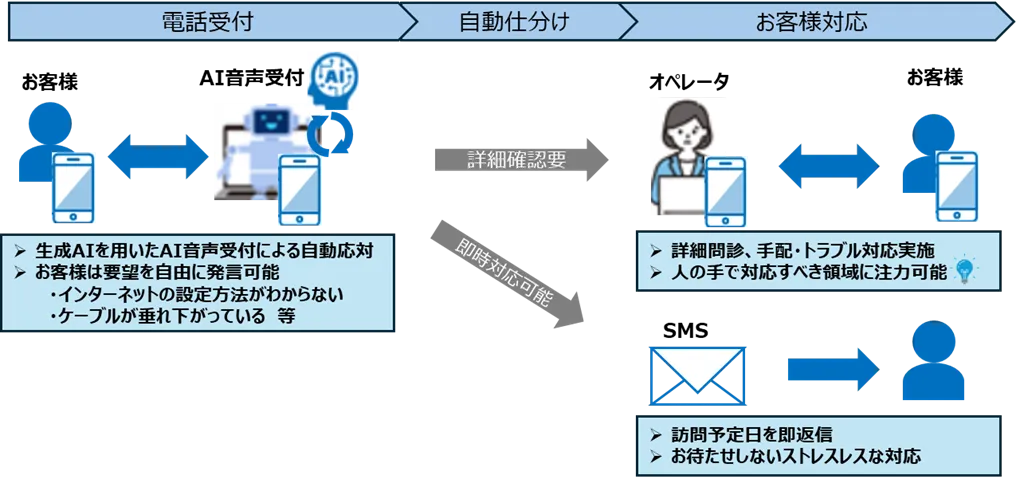 NTT西日本が導入する自動受付システムは、電話での問い合わせ内容を故障関連とそれ以外の事案に自動で仕分けします。特に故障以外の申告に関しては、お客さまの自然言語による発話をAIが解析し、内容を判断して適切な質問を行います。これにより、顧客自身が必要な情報を提供する手間が軽減され、よりスムーズな対応が可能となります。また、適切なプロセスに基づいて受付から対応までを一貫して行う仕組みを整えています。