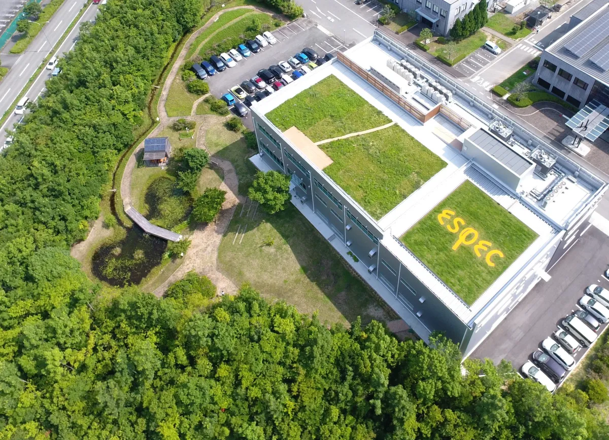 同センター内には「エスペックバンビの里」が設置されており、ここでは地域の植生調査に基づいて選定された65種類3万本の樹木を植樹した「エスペックの森」を造成。周囲の森林と連携を持たせることで自然環境との調和を図っています。また、地域性に配慮した草地と水辺からなるビオトープも整備され、多様な野鳥や昆虫が生息する生態系の創出に成功しています。