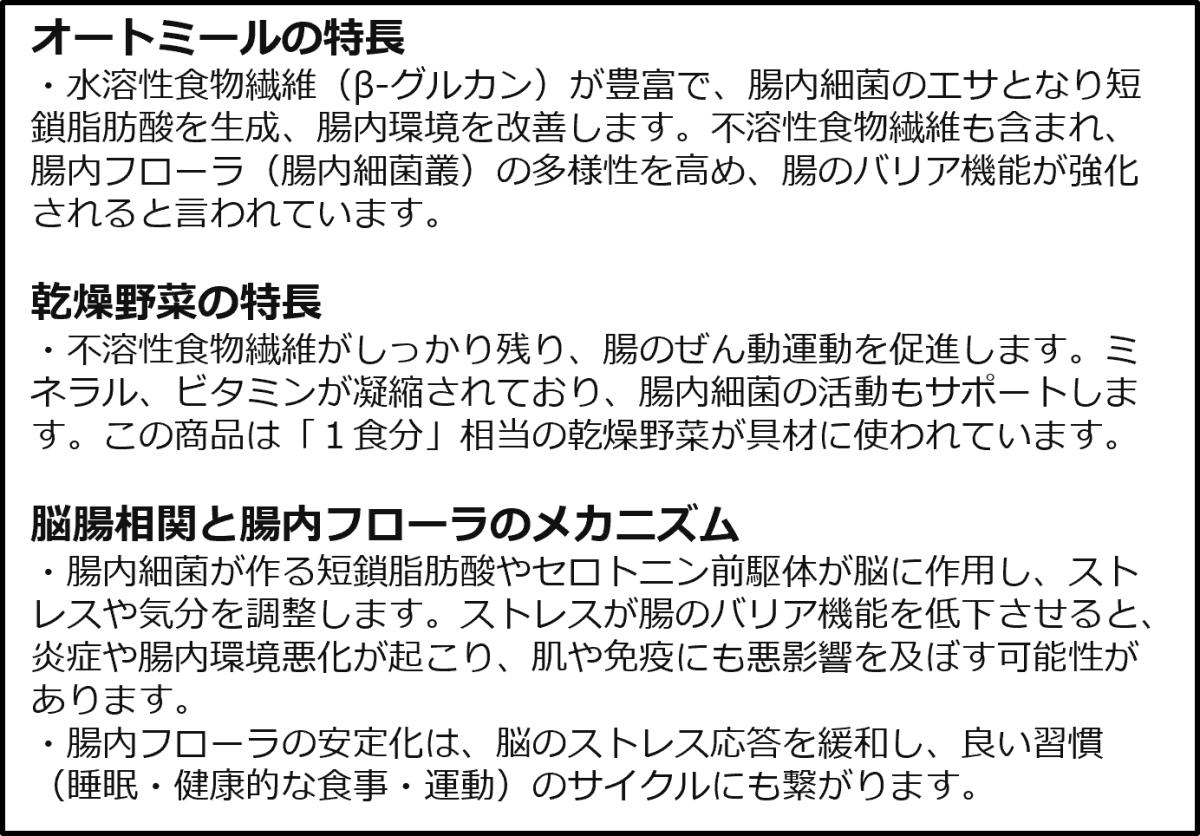 この商品が持つ特徴は、野菜1食分とオートミールの組み合わせによって腸内フローラを整える効果です。腸内フローラの改善は、脳と腸の健康に寄与し、気分の安定を促進、それが良い習慣の継続につながり、更に腸が整うというポジティブなサイクルを生み出します。