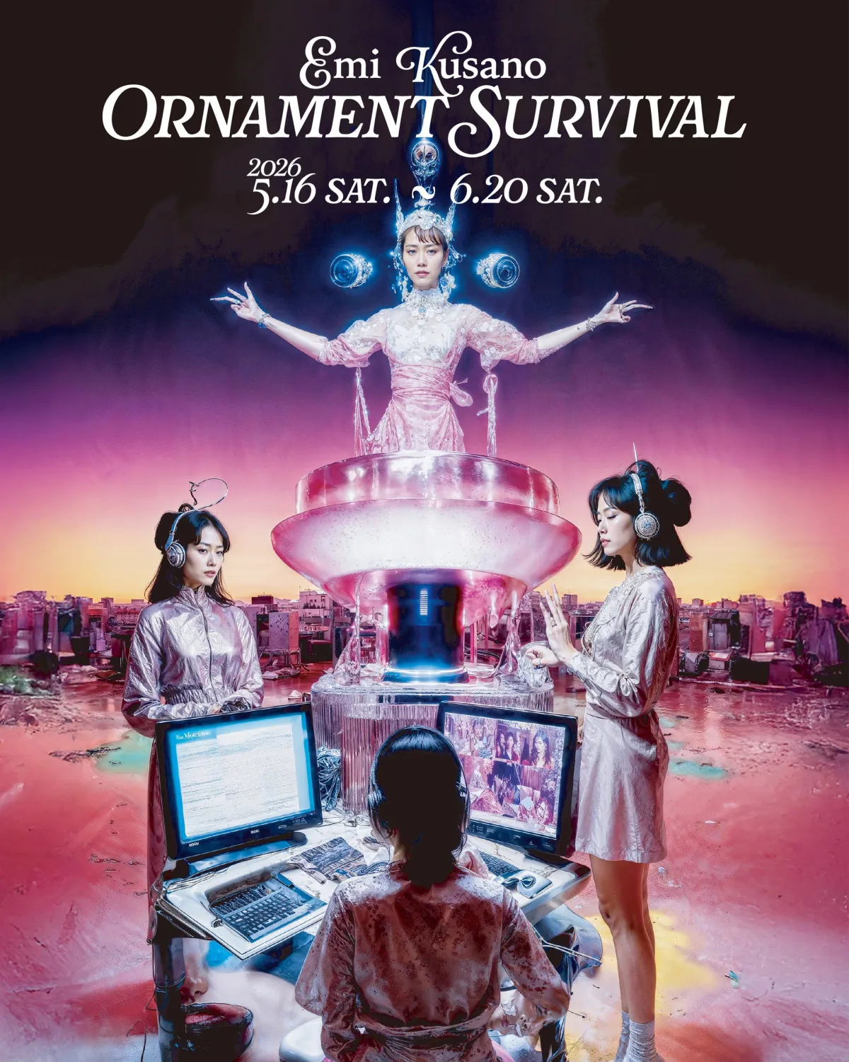 「Ornament Survival」は、私たち情報に翻弄されがちな現代人の自己や他者からの承認欲求をテーマにしています。溢れ出す欲望は、資源に変わっていく過程で、感情はデータ化され、私たちの存在そのものが曖昧になっていくというメッセージを伝えています。草野が幼少期に親しんだ1980年代から90年代の日本文化への憧れも反映され、現実と虚構の境界がますます不明確になっている状況を描き出します。