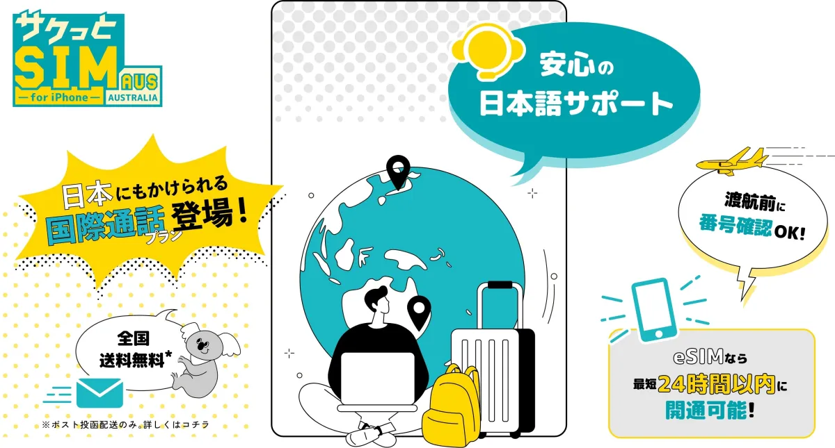 イエローモバイルが展開する『サクっとSIM 【AUS】』は、iPhoneをはじめとするSIMフリー端末で簡単に利用できるSIMカードです。オーストラリア最大の通信キャリアであるTelstraの回線を使用しているため、安心して通信を行うことができます。データ容量は5GBから180GBまであり、個々のニーズに合わせた選択が可能です。また、日本語でのサポートも提供されており、留学やワーキングホリデー中の方にも安心です。