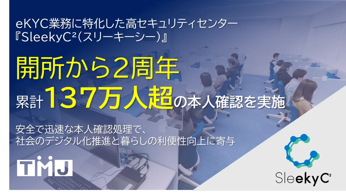 株式会社TMJが運営するeKYC業務専門センター『SleekyC²(スリーキーシー)』が、開所から2周年を迎えました。このセンターは、2023年3月10日に設立され、これまでに137万人を超える本人確認を実施してきました。特に2025年2月末時点では、オンライン決済や手続きの需要が高まる中、本人確認件数が急増しました。
