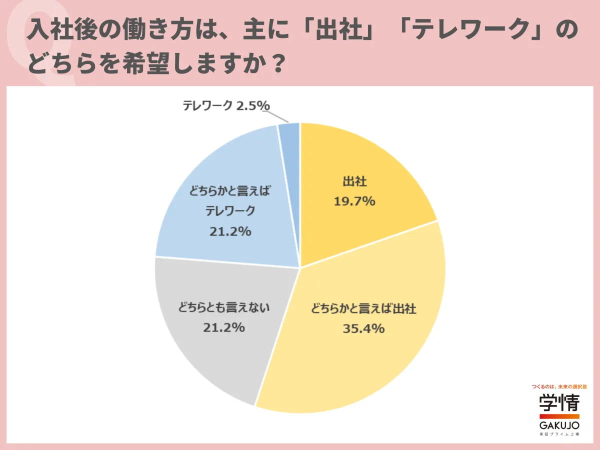 株式会社学情が実施した調査によると、2025年4月に新たに社会に出る新社会人たちの64.6%が「出社」を希望しています。この調査は、彼らがどのような働き方を想定しているのかを探るために行われました。コロナ禍においてテレワークが急速に広まった背景もあり、働き方に対する考え方が多様化していますが、出社を重視する声が増えていることが分かりました。