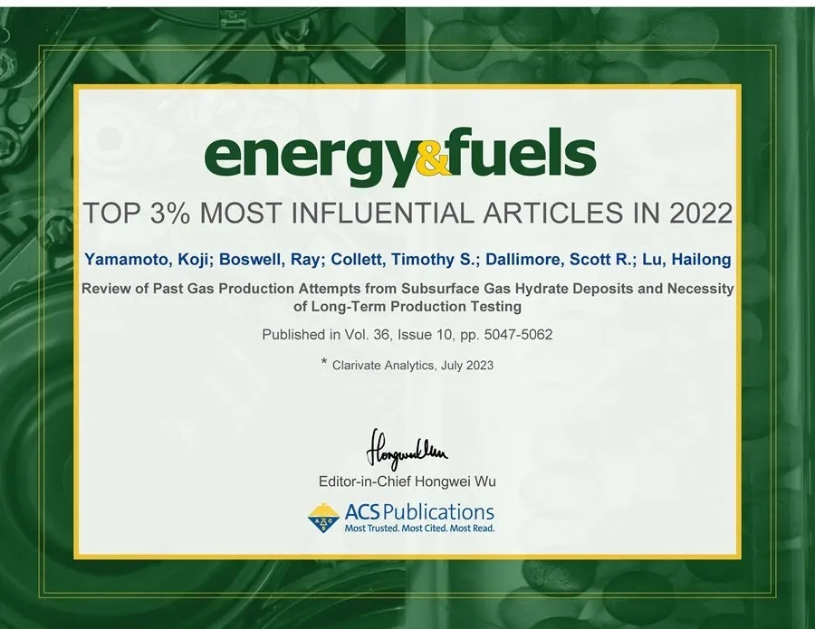 受賞した論文は2022年に発表され、雑誌「Energy and Fuels」に掲載されました。その内容は、各国におけるメタンハイドレート層からのガス産出試験に関するもので、実施されてきたさまざまな試験の条件、使用された技術、得られた結果と教訓を包括的にまとめています。