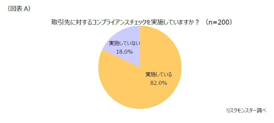 調査の結果、82%の企業が取引先に対してコンプライアンスチェックを行っていることが判明しました。これは、企業が反社会的勢力との関係を避けるために必要な対策を講じていることを示しています。業種別に見ると、特にサービス業が高い実施率を誇る一方で、製造業はその実施率が低い傾向にあるという結果も得られました。