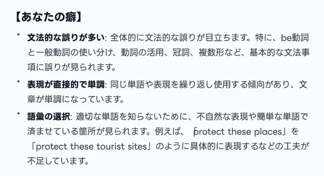 受験生が繰り返し犯しがちなミス、いわゆる「書き癖」をAIが分析します。例えば、「副詞の使い過ぎ」「接続詞の単調な使用」「動詞の誤用」など、個々のミスを特定し、次回の添削で意識すべきポイントを明示。具体的な改善策を提示することで、効率的な学習をサポートします。