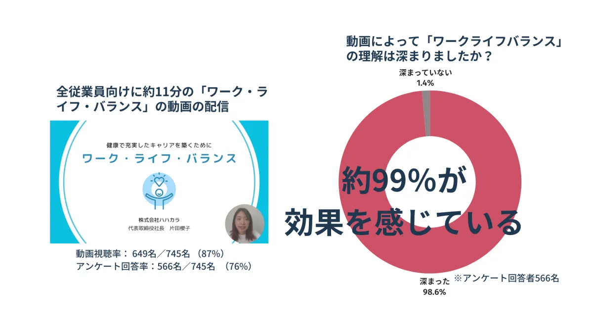 特にこの研修では、全社員に約11分の動画教材が配信され、視聴率は87%、アンケート回答率は76%という高い数字を記録しました。この結果、受講者の98.6%が「自分の理解が深まった」と回答し、多くの社員がライフワークバランスの重要性について真剣に考えるきっかけを得たとされています。