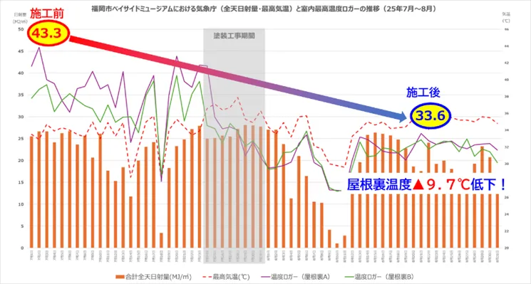 実証事業の結果、屋根表面温度は最大34.3℃、屋根裏の温度は最大9.7℃低下し、空調にかかる電力も同様の気象条件下で最大31.7%減少したことが確認されました。このような成果は、特に厳密に管理された気象条件で実施されたため、信頼性の高いデータとして評価されています。
