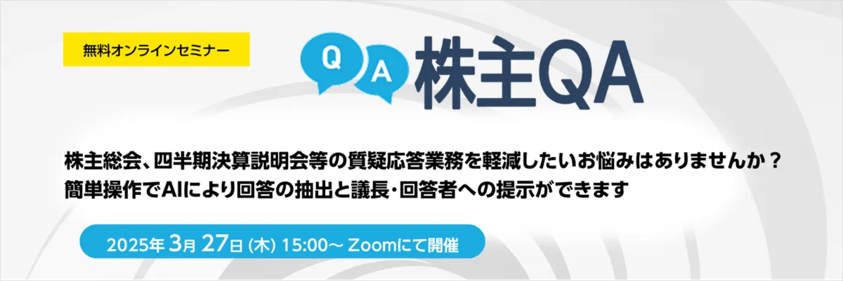 株式会社ニーズウェルが、2025年3月27日(木)15:00より、オンラインで「株主QA」に関する無料セミナーを開催します。このセミナーでは、株主総会や四半期決算説明会における質疑応答業務の効率化について具体的に学ぶことができます。