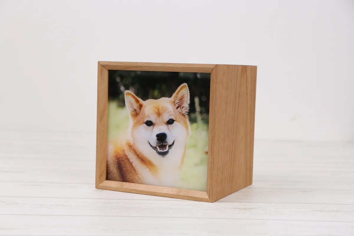 ケースの正面には愛するペットの写真をアクリル板に高精細向けにプリントしています。このUVプリンター技術により、透明感や奥行きを持った美しい仕上がりが実現され、柔らかな表情や毛並みの質感がしっかりと再現されます。ガラスよりも軽量で割れにくく、長期保存にも適しているため、大切な思い出の品に最適です。