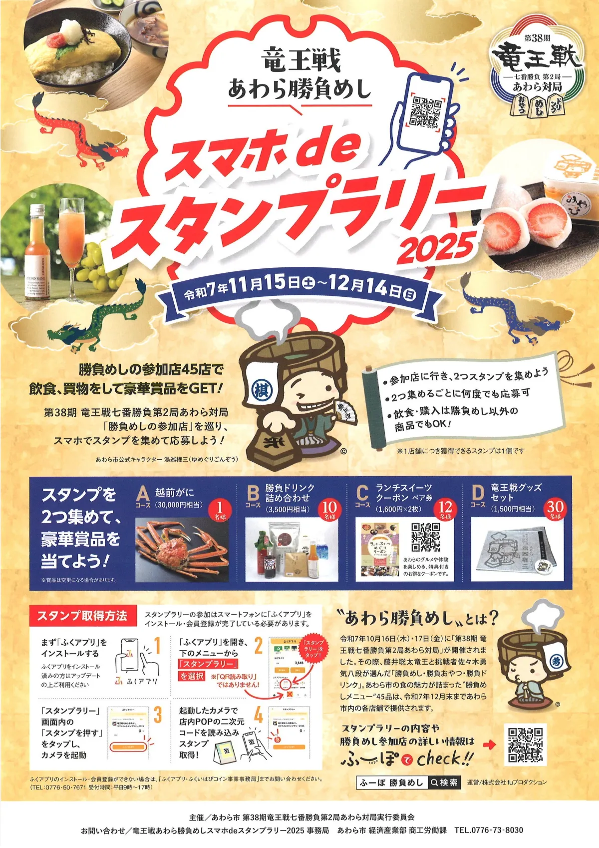 福井県あわら市で開催中の「勝負めしスタンプラリー」は、将棋ファンにはたまらない記念イベントです。日本将棋界の最高峰のタイトル戦である「第38期竜王戦七番勝負」の第2局があわら市で行われることを祝して、地元のグルメを楽しむスタンプラリーがスタートしました。参加者は、指定された店舗を巡りながら、地元の「勝負めし」を味わい、その体験を通じて豪華賞品が当たるチャンスを得ることができます。