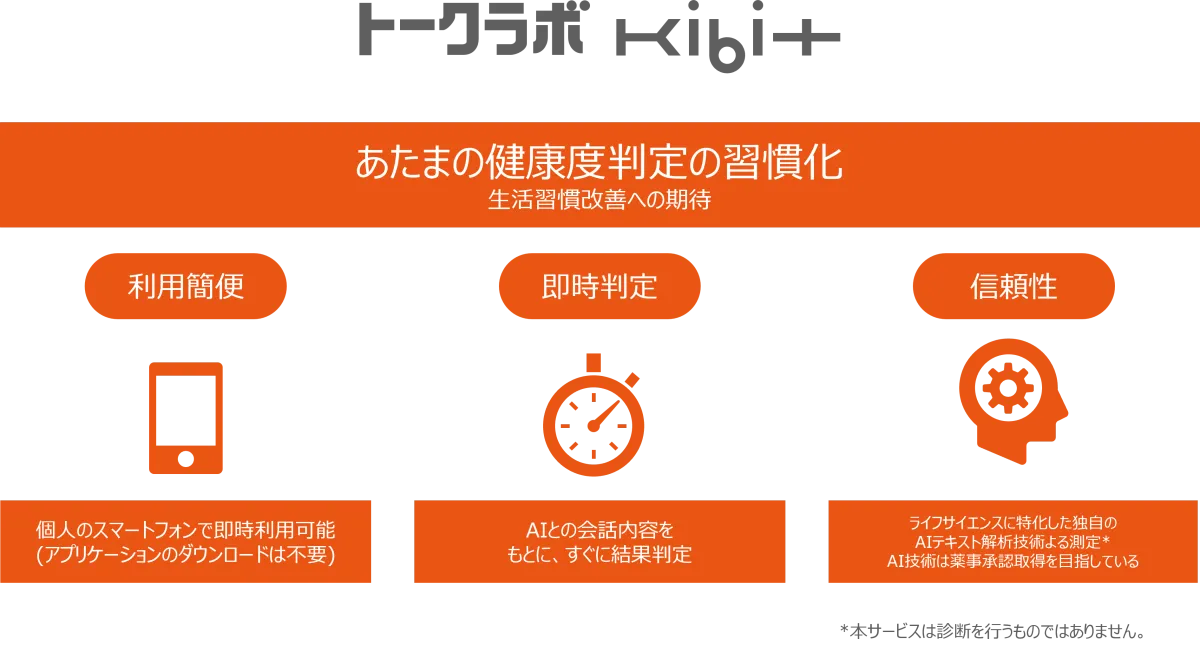 『トークラボKIBIT』は、スマートフォンを通じて簡単に利用でき、アプリのダウンロードは必要ありません。AIとの会話を通じて即座に健康度を判定できるため、手軽に日常の習慣として取り入れることができます。科学的信頼性を背景に、利用者は安心してこのツールを活用することができるでしょう。