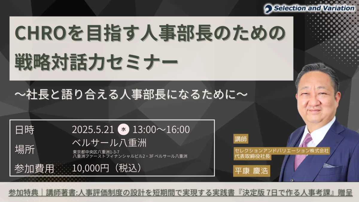 セレクションアンドバリエーション株式会社が主催するセミナー『CHROを目指す人事部長のための戦略対話力セミナー』が、2025年5月21日に開催されます。今年度は、特に経営者との対話が重要視される中での人事部長の新たな役割を強調し、未来のCHRO(最高人事責任者)を育成することを目的としています。