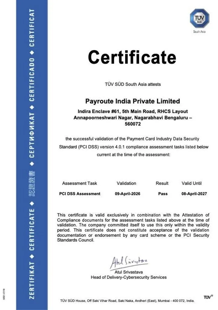 PCI DSS準拠には、第三者による訪問審査、自己問診、およびウェブサイトスキャンの3つの方法があり、Payroute India Private Limitedでは第三者による訪問審査により準拠認証を取得しています。