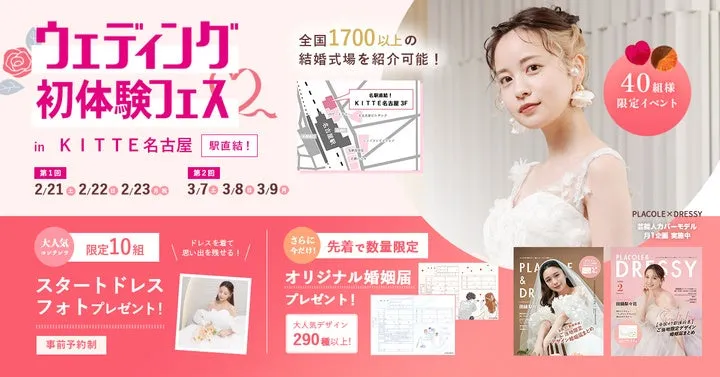 名古屋の中心、名古屋駅直結の商業施設KITTE名古屋3Fに位置する「DRESSY CAFE」で、2026年2月21日から23日までの3日間、結婚を考えるカップルに向けた特別なイベント「ウェディング初体験フェス」が開催されました。このイベントは、楽しく結婚式の準備を進めたいカップルに最適な内容が盛りだくさんです。特に、結婚準備を始めたばかりの方や式場選びに迷っている方にとって、非常に有益な情報を得られる貴重な機会となります。