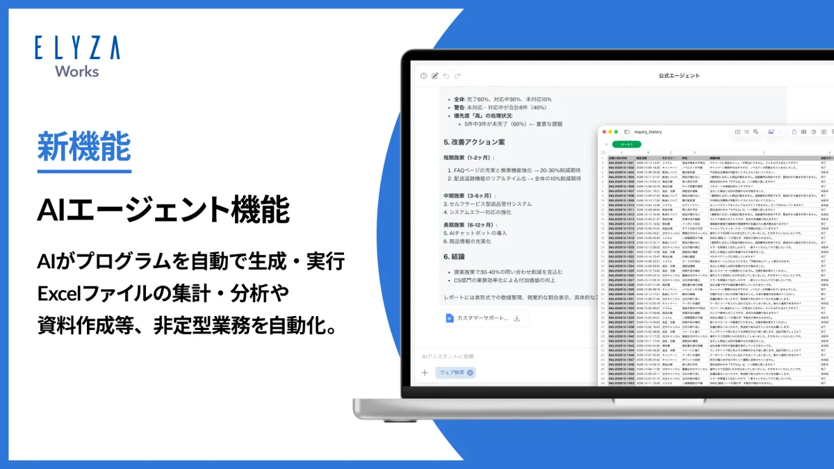 最近、株式会社ELYZAが展開する生成AI活用ツール「ELYZA Works」に新たな機能「公式AIエージェント」が追加されました。これにより、これまでマンパワーで行っていた業務処理が、AIによって自動化されることになります。特に、複雑な数値処理やファイル操作といった、これまでLLM(大規模言語モデル)の弱点とされてきた部分への対応が強化されました。