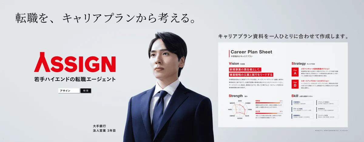 新CMには、アサインの転職支援を受けた久家隆宏さん(EYストラテジー・アンド・コンサルティング株式会社)と及川貴史さん(株式会社リンクアンドモチベーション)が出演しています。彼らは自身のキャリアでの選択についてお話しし、それが彼らの仕事にどのように影響を及ぼしているかを語ります。