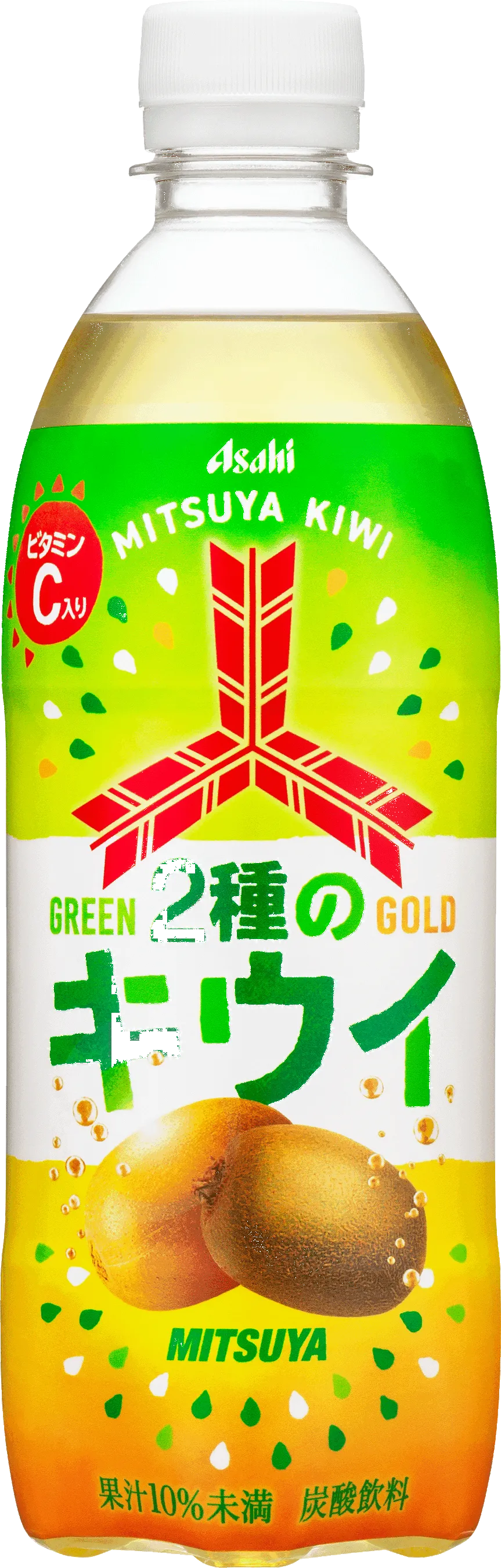 『三ツ矢2種のキウイ』のパッケージは、グリーンキウイとゴールドキウイをイメージした2色を基調にデザインされている。さらに、商品の特徴を明確に伝えるために、「2種のキウイ」と「ビタミンC入り」の文字を配した。また、「三ツ矢」の象徴である矢羽根とキウイのイラストもあしらわれ、視覚的にも楽しめる内容となっている。