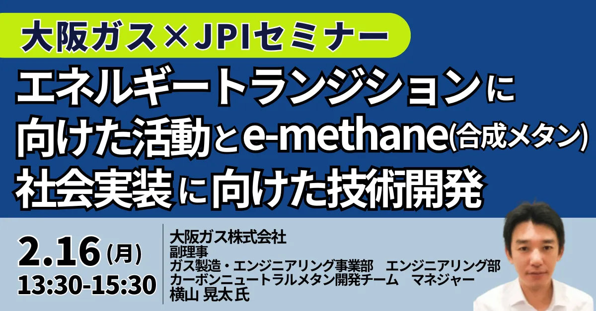 2026年2月16日、大阪で開催されるセミナーは、エネルギートランジションにおける大阪ガスの取り組みと、合成メタン(e-methane)の技術開発について深く掘り下げる内容です。このイベントでは、大阪ガスの副理事であり、カーボンニュートラルメタン開発チームのマネジャーである横山晃太氏が講師を務め、参加者に新たな知識と視点を提供します。