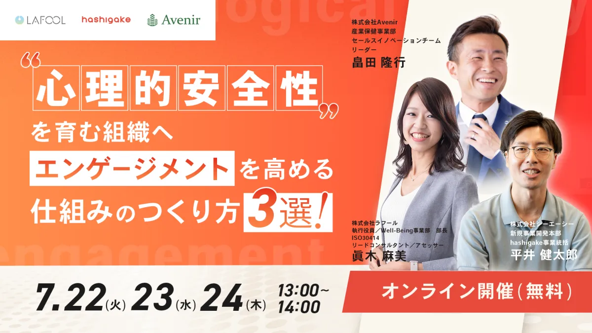 2025年7月22日から24日まで、株式会社ラフールが主催する「心理的安全性を育む組織へ!エンゲージメントを高める仕組みのつくり方3選」というセミナーが開催されます。このイベントは、少人数制のオンラインセミナーで、参加者はZoomウェビナーを利用して自宅やオフィスから参加可能です。開催日には参加費が無料で、さまざまな企業の事例が紹介される予定です。