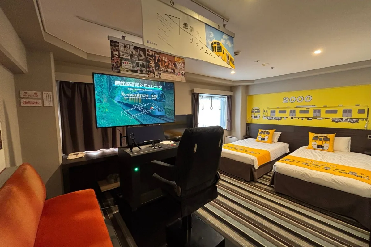 イエローカラーで彩られた空間:部屋全体が西武鉄道2000系の象徴的なイエローカラーでコーディネート。じっくりと鉄道の世界観に浸れます。