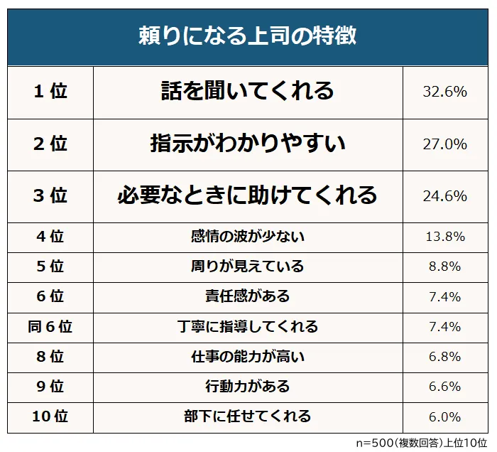 この調査では、頼りになる上司として評価された特徴がランキング形式で整理されています。最も多くの回答を得たのは「話を聞いてくれる」というもので、32.6%がこの特性を挙げました。続いて「指示がわかりやすい」(27.0%)や「必要なときに助けてくれる」(24.6%)という回答が上位にランクインしました。これらの特徴は、上司が部下をしっかりと支え、安心して業務を進めるための重要な要素です。