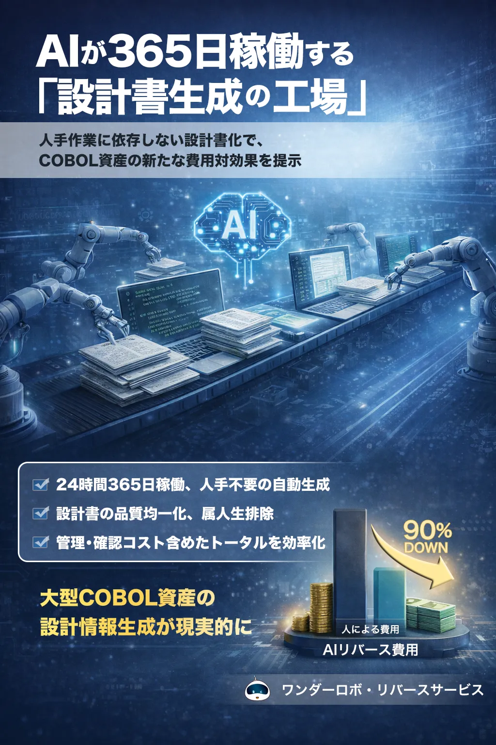 ワンダーロボ・リバースサービスでは、AIの解析処理が時間に関係なく行われるため、365日常に安定した速度で設計書が生成されます。これにより、大規模な資産でも一定のクオリティが保たれ、スピーディなリバース処理が可能です。世の中の動きが早い中で、こうした仕組みは非常に重要であり、企業の競争力を支えています。
