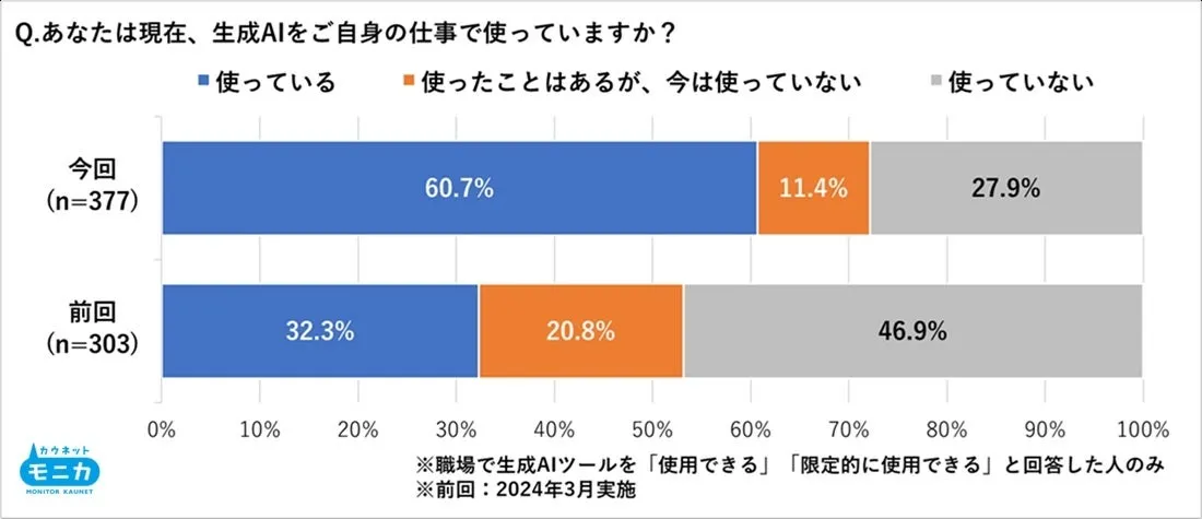 近年、私たちの生活や働き方に影響を与えている生成AIの利用状況が急速に変化しています。特に職場での生成AIの使用率は、約2年前の32.3%から60.7%へとほぼ倍増しました。一方、プライベートでの使用率も10.6%から34.6%に増加しており、その効果を実感している人が多いことが調査から明らかになっています。