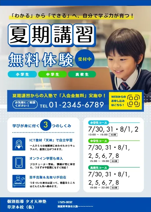 高額なシステムは必要ありません。ChatGPTなどの無料ツールを中心に、どのように活用できるかを解説します。例えば、AIを使ったチラシ作成の手法では、生成AIに塾の情報を読み込ませて最適な内容へとテキストを修正する方法を示します。