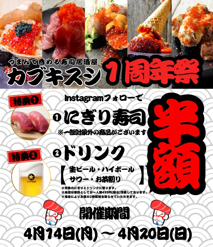 「カブキスシ」では、1周年祭の期間中、にぎり寿司とドリンクがなんと半額となるお得な特典があります。対象となるにぎり寿司とドリンクが半額で楽しめますが、注意点もあるので事前にチェックしておきましょう。特に、18日・19日はキャンペーン対象外となるのでご注意ください。 また、席料としてお一人様439円(税込)が必要となりますが、これは居酒屋の雰囲気を楽しむための心地よいサービスとしてご理解いただければと思います。