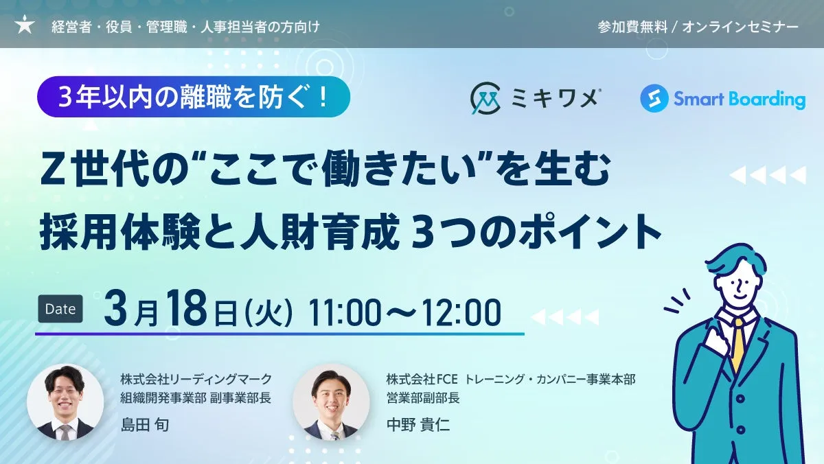 2025年3月18日(火)11:00より、株式会社FCEが提供する人財育成プラットフォーム「Smart Boarding」と株式会社リーディングマークとの共催でセミナーを実施します。このセミナーでは、Z世代が求める“成長できる企業”の条件を解説し、具体的な施策を紹介します。