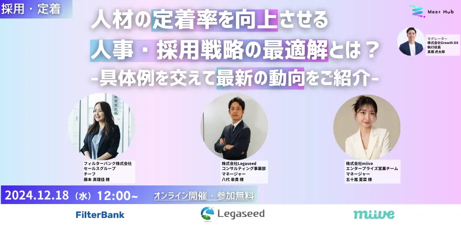 2024年12月18日(水)、株式会社Growth DXが主催するウェビナー、「人材の定着率を向上させる人事・採用戦略の最適解とは?」が開催されます。このセミナーでは、企業が直面する離職率の問題に焦点を当て、採用プロセスや人事制度の改善方法を具体的な例とともに解説します。