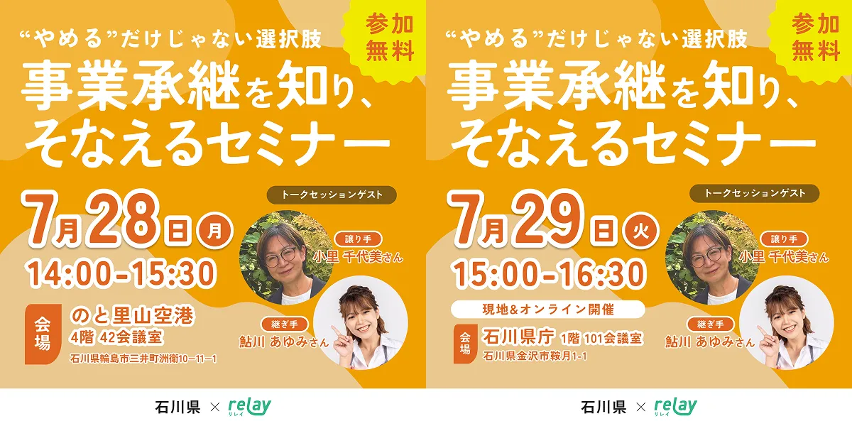 2025年7月28日と29日の2日間、石川県にて小規模事業者や個人事業者を対象とした事業承継セミナー「relay(リレイ)」が開催されます。このセミナーは、株式会社ライトライトが運営するオープンネーム事業承継の一環で、地域経済の持続的発展を目指すものです。
