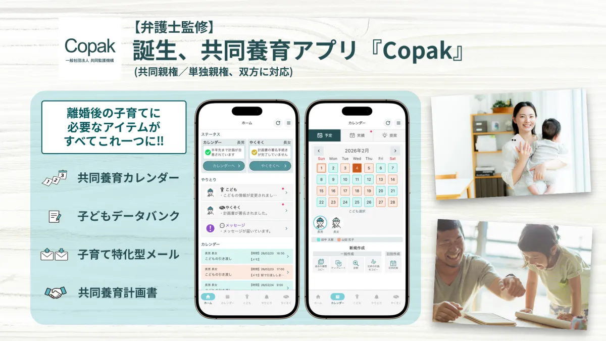 一般社団法人共同監護機構が、2026年4月から施行される「離婚後共同親権制度」に対応したアプリ『Copak(コパック)』のAndroid版を正式にリリースしました。今後、iOS版も登場予定で、共同親権の重要性が高まる中、離婚後の父母に向けて、子どもを中心に穏やかな共同子育てを実現することが目的です。このアプリは、海外の共同親権の実務事例を参考に設計されており、専門家の監修のもとに開発されています。