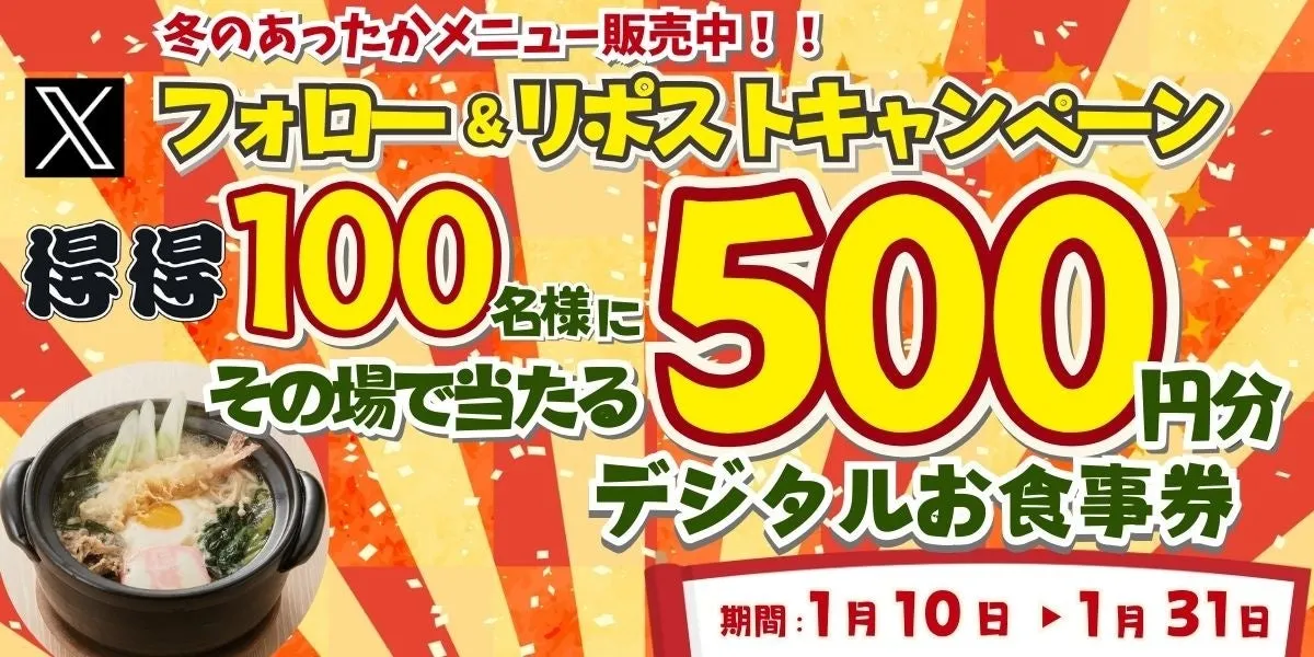 大阪に本社を置く株式会社家族亭が運営するうどんチェーン「得得」は、2025年1月10日(金)から31日(金)までの期間、フォロー&リポストキャンペーンを実施します。このキャンペーンは、得得公式Xをフォローしてキャンペーンポストをリポストするだけで参加可能。抽選で100名様に得得店舗で使える「デジタルお食事券500円分」がその場で手に入ります。