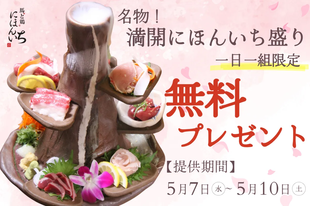 大阪堺筋本町に位置する『純国産馬刺しと朝引き鶏 にほんいち』では、驚きのキャンペーンが開催されます。2025年5月7日から5月10日の期間中、名物商品「満開にほんいち盛り」を1日1組に限り無料で提供します。このキャンペーンは、馬刺しと鶏刺しの魅力を新たに知ってもらうために企画されました。