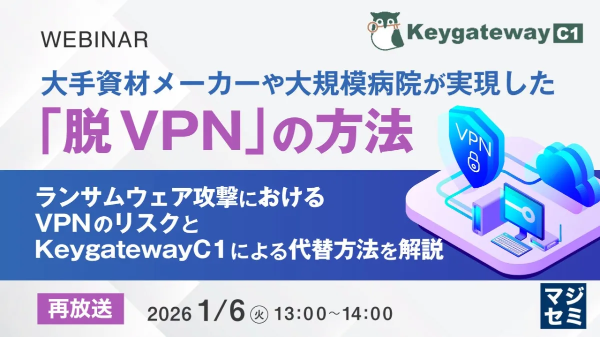 その解決策として、マジセミ株式会社が主催する「脱VPN」のウェビナーが開催されます。このセミナーでは、大手の資材メーカーや大規模な病院が実際に「脱VPN」を実現した事例を紹介します。特に、ゼロトラスト接続サービス「KeygatewayC1」を活用する方法に焦点を当て、安全なネットワーク環境の構築とランサムウェアリスクの低減に成功した具体的な手法をお伝えします。