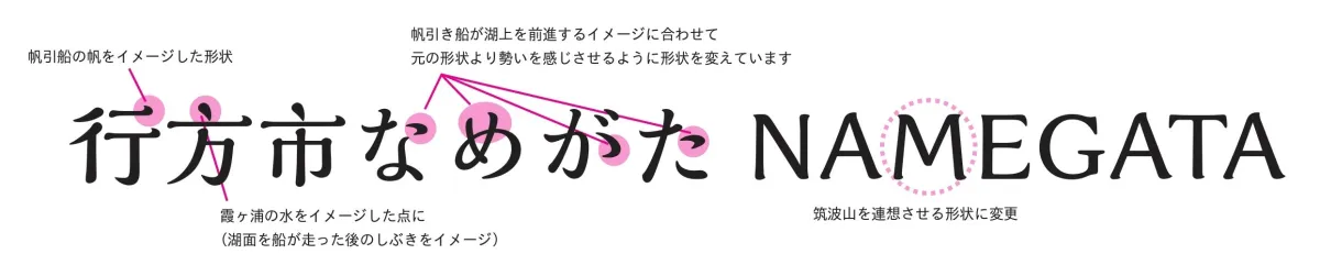 このフォントには、行方市らしさを表現するためのカスタマイズが施されています。特に注目すべきポイントは、フォントに取り入れられた以下の3つのデザイン変更です: