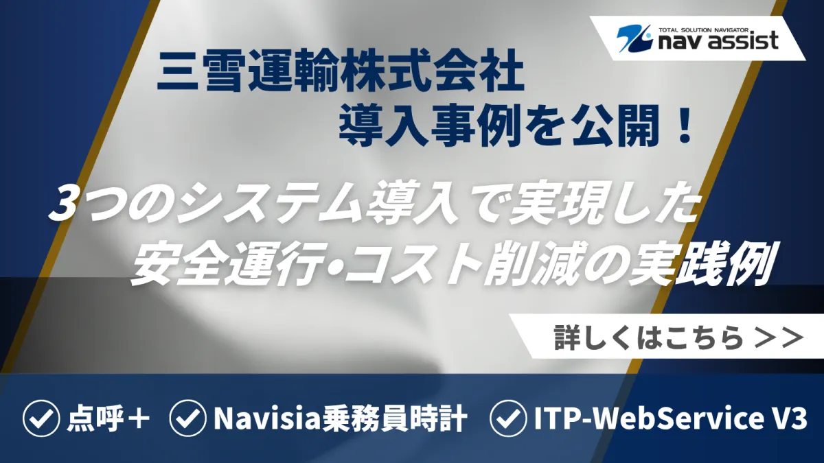 三雪運輸は、従来の運行管理方法を克服するために、株式会社ナブアシストのシステムを段階的に導入しました。主に3つのシステム「点呼+」「Navisia乗務員時計」「ITP-WebService V3」を組み合わせて使用し、業務をデジタル化しました。