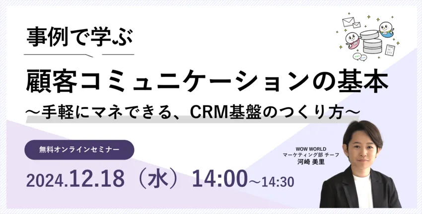 株式会社WOW WORLDは、2024年12月18日(水)にオンラインで「事例で学ぶ顧客コミュニケーションの基本~手軽にマネできる、CRM基盤のつくり方~」というタイトルの無料セミナーを開催することをお知らせします。今回は、実際のお客様の事例を中心に、CRM基盤の構築方法について具体的に説明します。