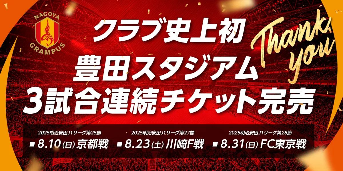 名古屋グランパスが8月31日(日)に豊田スタジアムで行われる明治安田J1リーグ第28節FC東京戦のチケットを全席種完売させたことが報告されました。これにより、今シーズン、ホームゲームでは京都サンガF.C.戦(8月10日)と川崎フロンターレ戦(8月23日)に続き、3試合連続のチケット完売を成し遂げることとなりました。この快挙は、クラブ史上初の記録となり、名古屋グランパスのさらなる飛躍を象徴するものです。