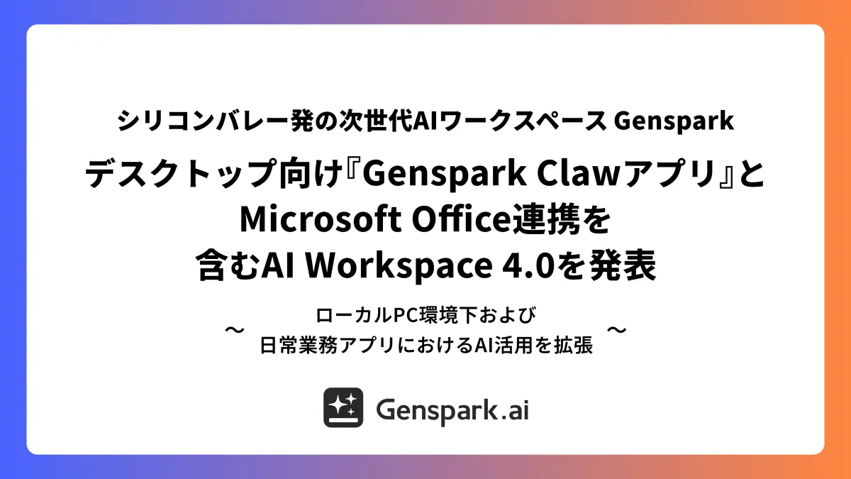 シリコンバレー発の次世代AIワークスペース「Genspark」(ジェンスパーク)が、待望の『Genspark AIワークスペース 4.0』を発表しました。新たにローカル環境で使用可能なデスクトップアプリ『Genspark Clawアプリ』を導入し、Microsoft Officeとの統合も実現しました。これに伴い、Gensparkはわずか12か月で年間ランレート2.5億ドル(ARR)を達成したとしています。