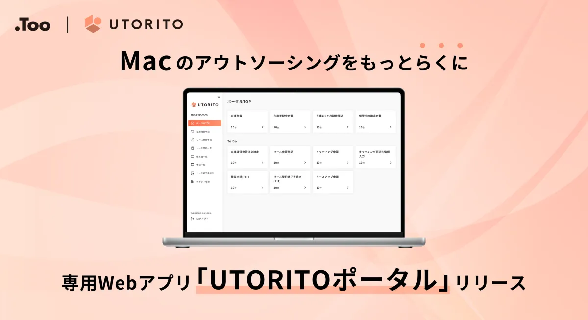 株式会社Tooが提供する法人向けMacのライフサイクルマネジメントサービス「UTORITO」(ユトリト)が、専用のWebアプリ「UTORITOポータル」をリリースしました。この新たなポータルを通じて、Macの導入から運用までをワンストップで支援する新たなサービス体制が整いました。