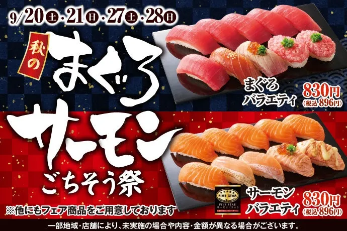9月20日(土)から始まる「秋のまぐろサーモンごちそう祭」は、小僧寿しが贈る絶対に見逃せないフェアです。このフェアでは、人気ナンバーワンのネタ「まぐろ」と、秋の味覚の代表格「サーモン」が登場します。まさにこの季節にぴったりの豪華なメニューが楽しめるチャンスです!